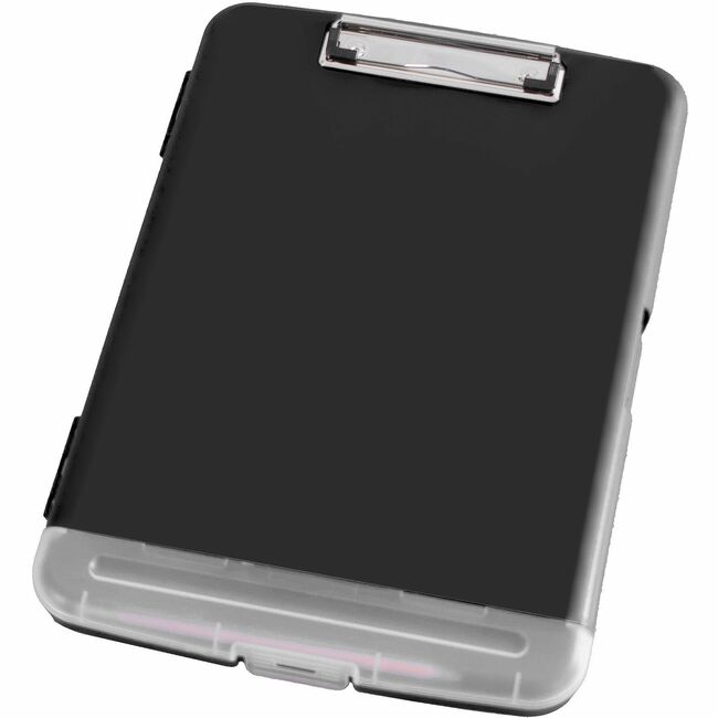 Storage Clipboard features a buckle that easily opens to access and store items. Storage compartment holds up to 160 sheets. Nickel-plated metal clip securely holds documents. Plastic material provides a smooth surface to write on. Additional pen compartment keeps your writing utensils within reach and conveniently accessible. Hanging holes allow you to store your clipboard when not in use.