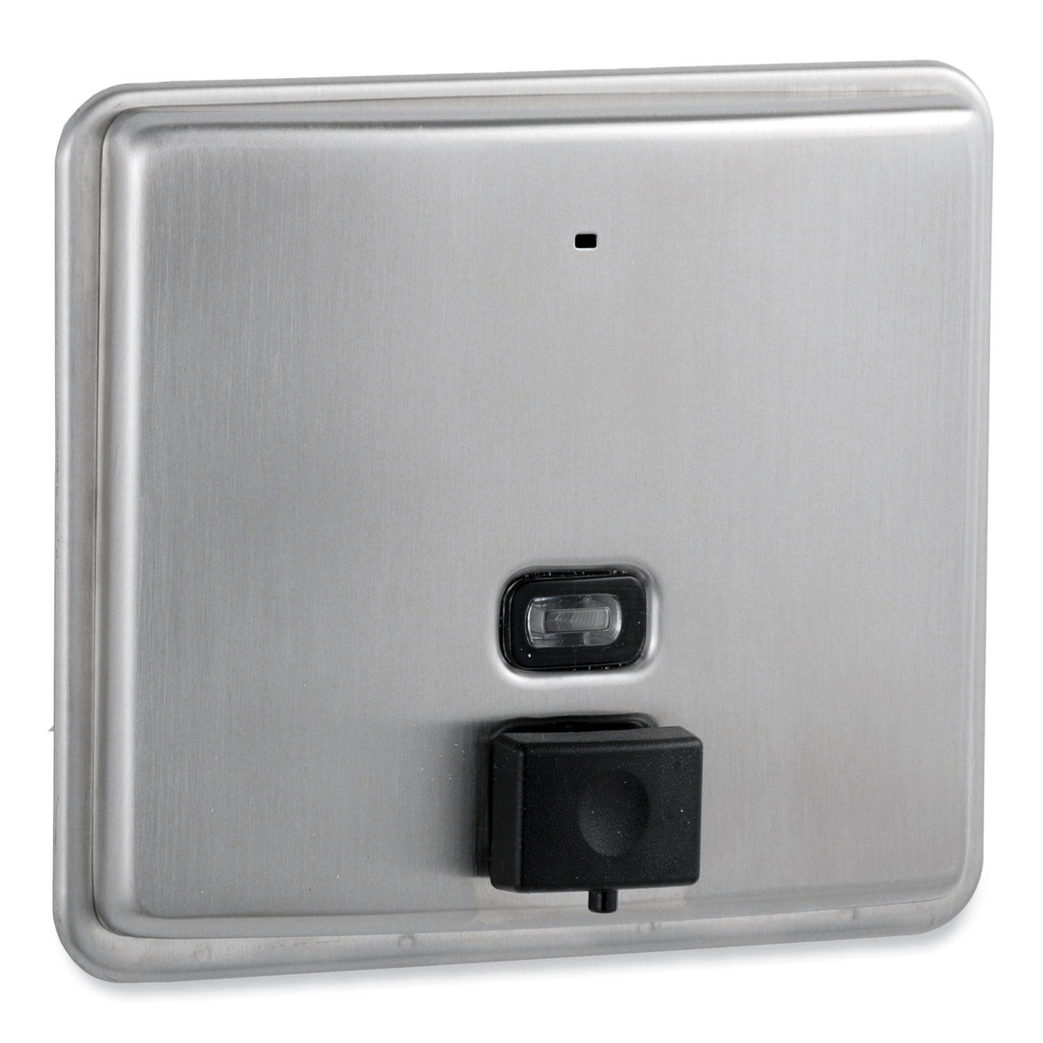 Dispenses all-purpose soaps. One-piece front, satin-finish stainless steel with vessel attached to back. Pulls out for filling. Concealed locking device. Wall to push-button, 1.63". Soap Dispensers Type: For Liquids; Interior Volume Capacity: 50 oz; Mounting: Wall; Material(s): Plastic/Stainless Steel.