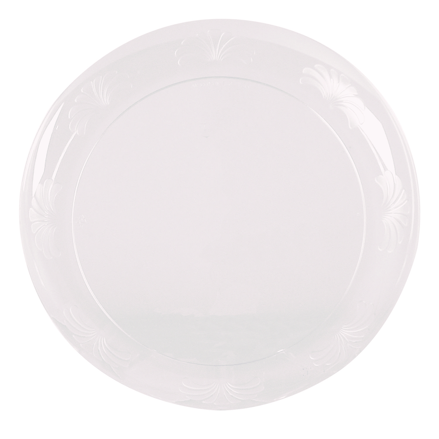 Lovely etched plastic dinnerware is made from heavyweight, durable material. Traditional floral etching brings an upscale feel to any event. Designed to complement any food presentation. Provides the beauty of glass with the ease of a disposable. Dinnerware Type: Plate; Material Type: Plastic; Material(s): Plastic; Shape: Round.