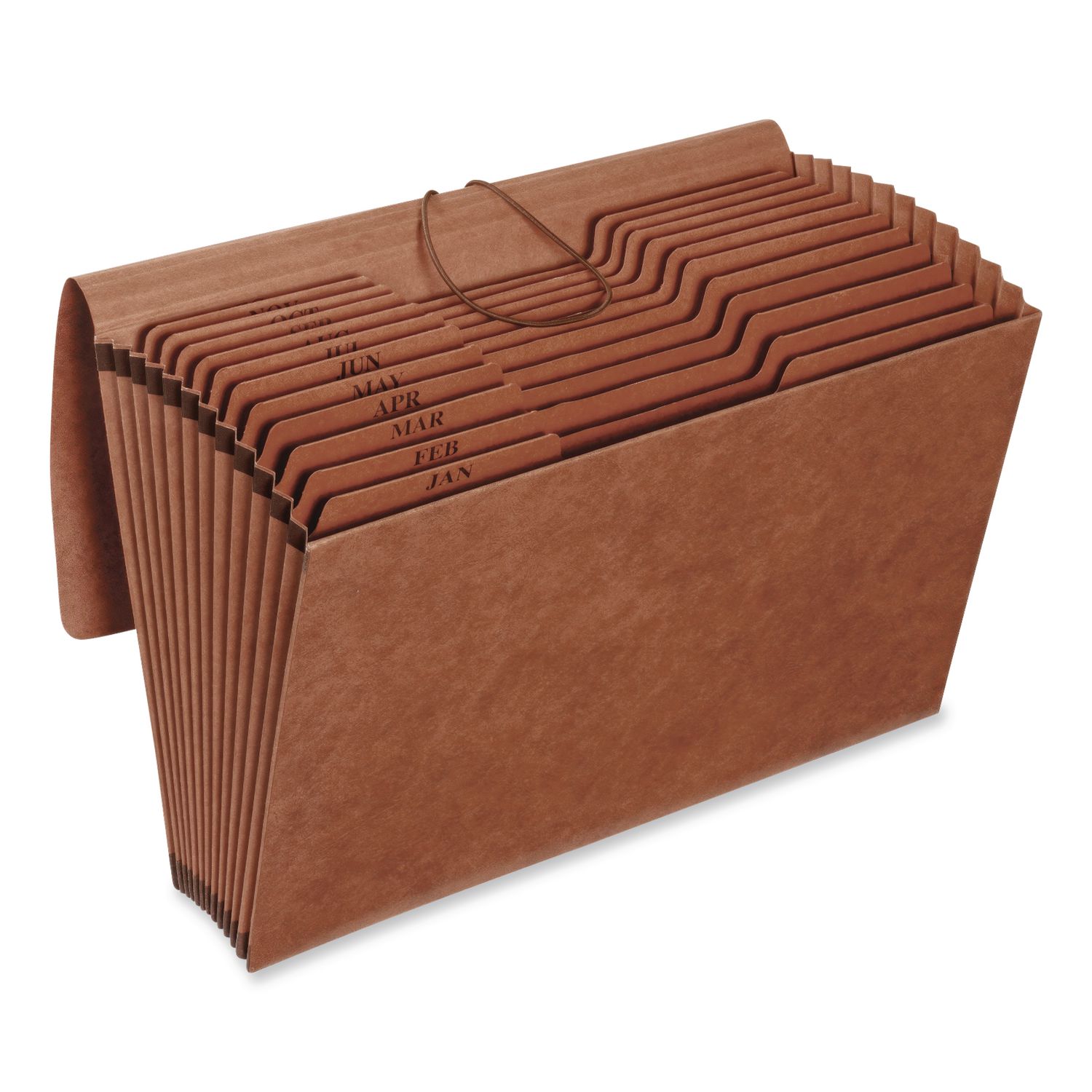 File and store documents safely with the Pendaflex® Heavy-Duty Expanding File. Featuring extra-thick, 80-pt soil-resistant covers and rip-proof Tyvek® reinforcement along the top and bottom of each gusset, this file is built to last. Index features extra-large, 1/3-cut double-top tabs. Left tab position is pre-labeled, and the right tab position is customizable. Monthly Index. Pocket/Wallet Type: Filers/Papers; Size: Legal; Overall Expansion: 5.25"; Closure Type: Elastic Strap.