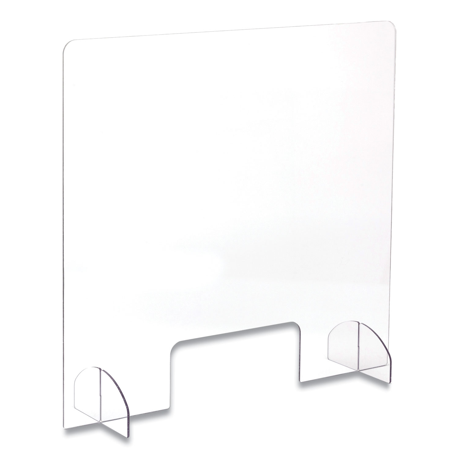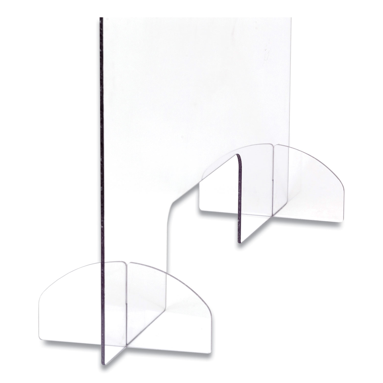 With a clear, all-acrylic construction and freestanding design, Safco's portable sneeze guard with document pass-through allows workers and customers to speak and interact visually while establishing a physical barrier to help reduce exposure to droplets produced by sneezing, coughing and talking. Smooth, clean edges on all pieces of the sneeze guard ensure a professional look and safer handling. Reposition the freestanding, portable sneeze guard with ease and use it in different areas of your small business, bank, office, or retail store. Ideal for reception stations, cashier stands, teller windows, service counters and desks. Quickly and easily assemble the portable sneeze guard by sliding the feet into the pre-cut slots on the base of the shield panel - no tools required. Peel away protective film on all pieces before assembly. Easy to clean and wipe down. With Document Pass Through—12"w x 5"h. Color: Clear; Overall Width: 30"; Overall Depth: 8"; Overall Height: 28".