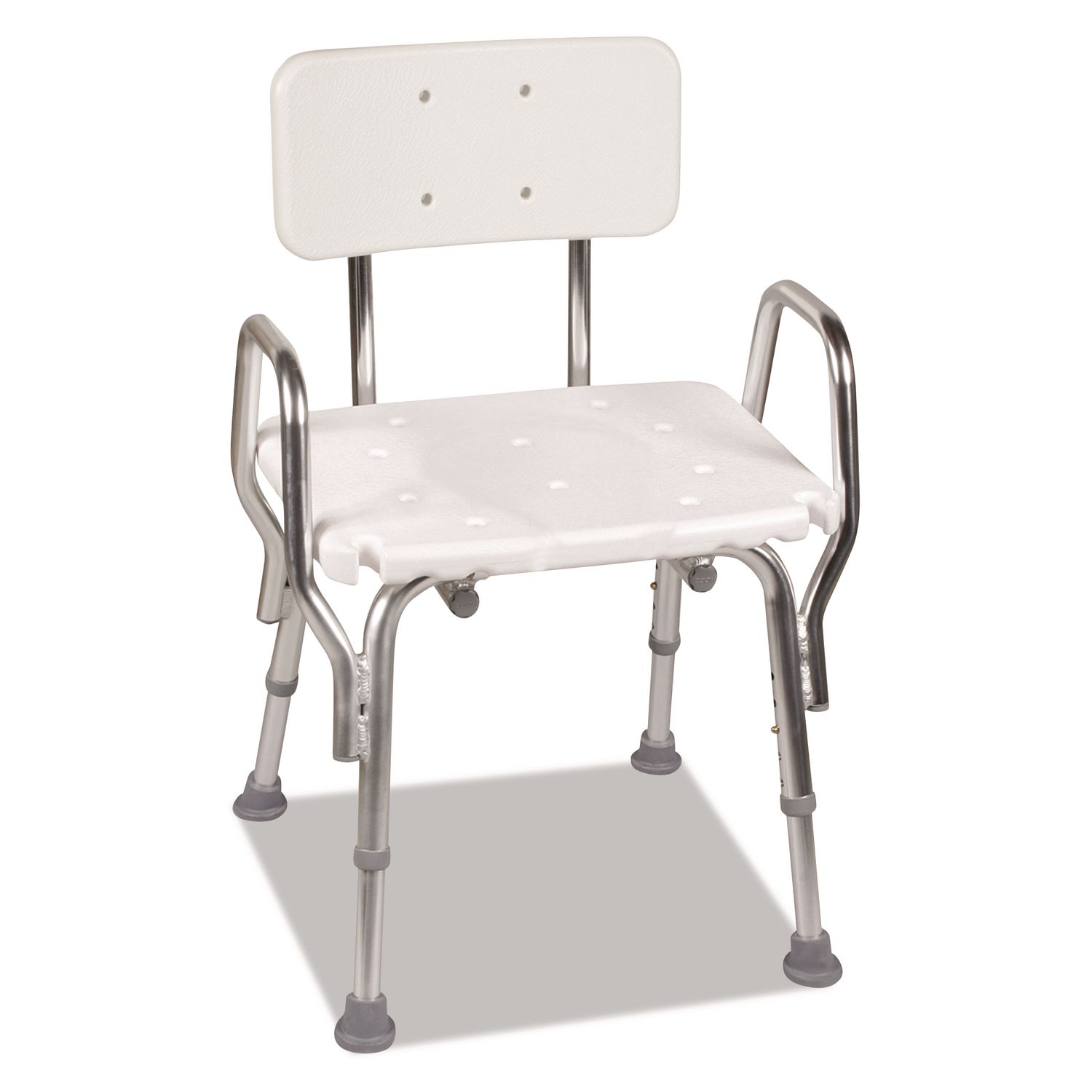 Blow-molded plastic seat with textured, non-slip surface. Arms provide additional support and safety. Lightweight, aluminum frame. Slip-resistant, suction cup tips. Seat height adjusts from 16" to 20" in 1" increments. Tool-free assembly. Contains latex. With Back. Recommended Application Area(s): Healthcare; Specialty; Seat Color: White; Back Color: White; Color Family: White.