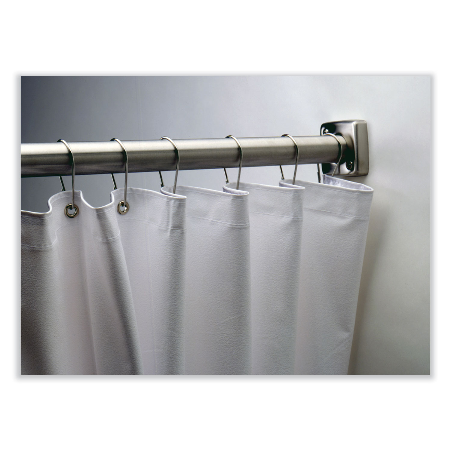 Opaque, matte vinyl, 0.008? thick shower curtain contains antibacterial and flame retardant agents. White HDPE grommets along top, one every 6?. Hemmed bottom and sides. Requires seven hooks (not included). Material(s): Vinyl; HDPE; Size (W x L): 42 x 72; Color(s): White.
