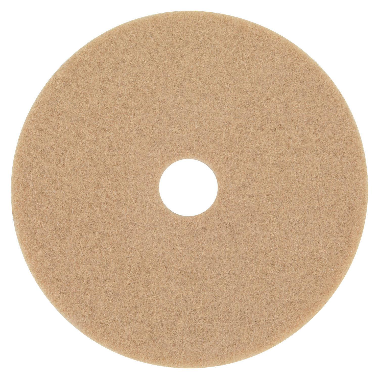 3M™ Tan Burnish Pad 3400 produces a good gloss while removing black marks and scuffs, and is ideal for harder finishes. The pad is made of polyester fibers in an open-textured non-woven construction which resists loading and clogging. The washable, reusable pad is conformable, offering high pad-to-floor contact. Fine polishing particles are distributed throughout the pad to deliver high-quality performance over the life of the pad. For use with cord-electric, battery-electric, or propane-powered ultra-high speed floor machines operating at 1500 rpm or greater. The pad is reversible. Floor Pads Application: Burnishing; Diameter: 17"; Color(s): Tan; Color Family: Beige.